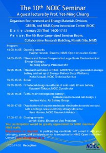 On Thursday, January 23, 2014, having Prof. Yet-Ming Chiang of MIT as a guest lecture, NIMS will held the 10th NIMS Open Innovation Center Seminar at Namiki site, NIMS, Japan.